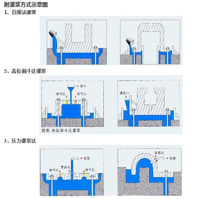 根據(jù)設(shè)備機座的實際情況,選擇相應(yīng)的灌漿方式,由于該材料具有很好的流動性能,一般情況下,用“自重法灌漿”即可,即將漿料直接自模板口灌入,完全依靠漿料自重自行流平并填充整個灌注空間,若灌注面積很大、結(jié)構(gòu)特別復(fù)雜或空間很小而距離很遠時,可采用“高位漏斗灌漿”或“壓力法灌漿”進行灌漿,以確保漿料能充分填充各個角落。